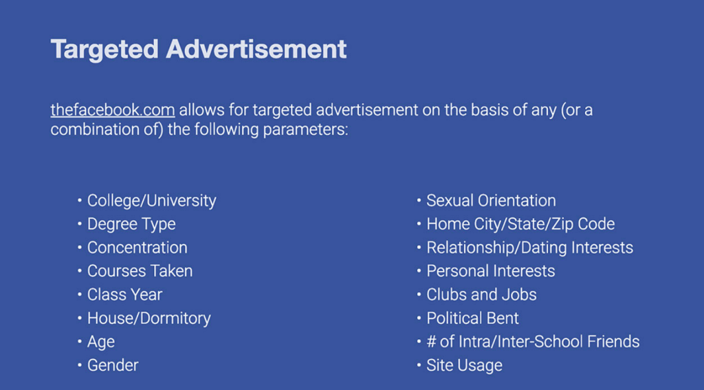 C’è in questa affermazione un’inversione di causa ed effetto in cui sembra quasi che lo scopo principale di Facebook sia offrire connessione e non creare profitto. Senz’altro esistono startup che hanno iniziato senza l’intenzione di commercializzare il proprio prodotto e che solo successivamente si sono trovate in mano un potenziale di guadagno. Ma il modello di business di Facebook era già chiarissimo nel 2004, come si può vedere dalla slide di seguito riportata, estratta dalla presentazione agli investitori preparata da Eduardo Saverin, uno dei soci degli esordi della piattaforma.