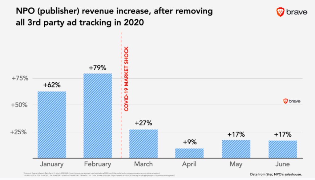 Ancora più sorprendente il fatto che, nonostante le profezie di sventura, NPO ha fatto più soldi in conseguenza della sua scelta, e nemmeno pochi di più. Johnny Ryan, CEO di Brave (browser costruito su principi di protezione della privacy) ha presentato i risultati di sei mesi di advertising non personalizzato del gruppo in questo articolo, di cui riporto qui sotto il grafico più esemplificativo.